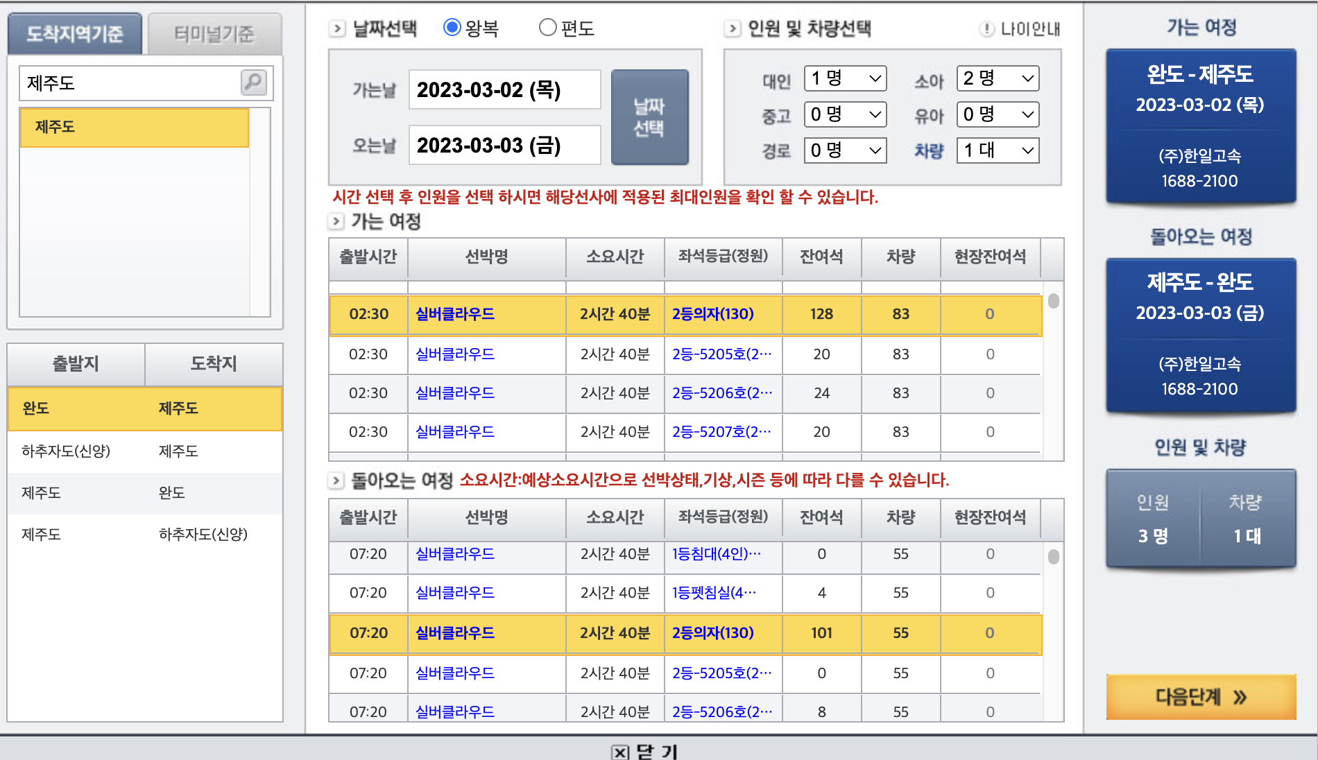 3. 도착지역기준 '제주도', 날짜선택(가는날, 오는날), 왕복, 인원, 차량 선택, 가는 여정(출발시간, 좌석등급), 돌아오는 여정(출발시간, 좌석등급)을 선택한다음에 '다음단계' 버튼을 클릭한다.