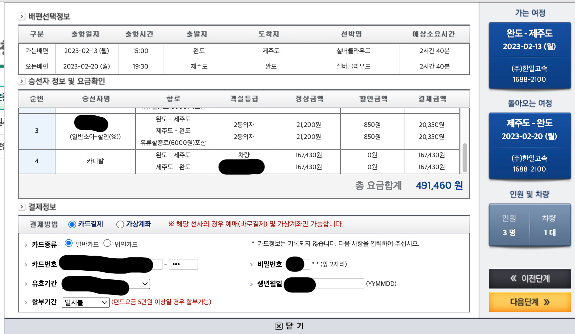 4. 승선자명, 성별, 생년월일, 연락처, 표종류(일반대인, 일반소아), 차량정보입력(차량종류, 차량번호, 운전자명, 연락처) 입력후에 '다음단계' 버튼을 클릭한다.