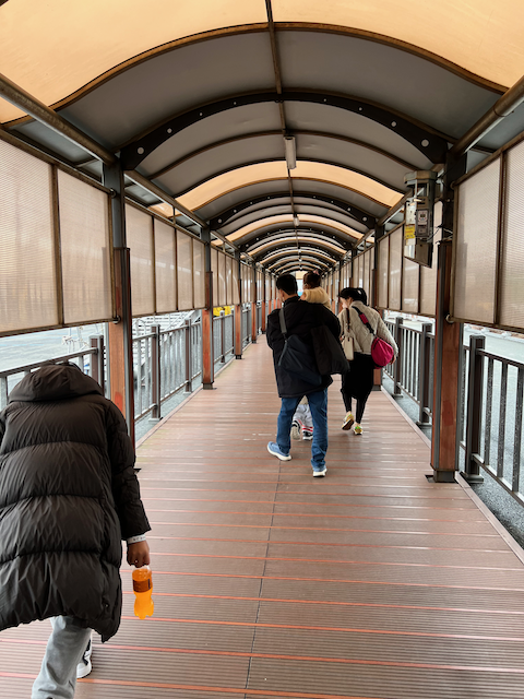 배에서 여객터미널로 걸어서 이동합니다.