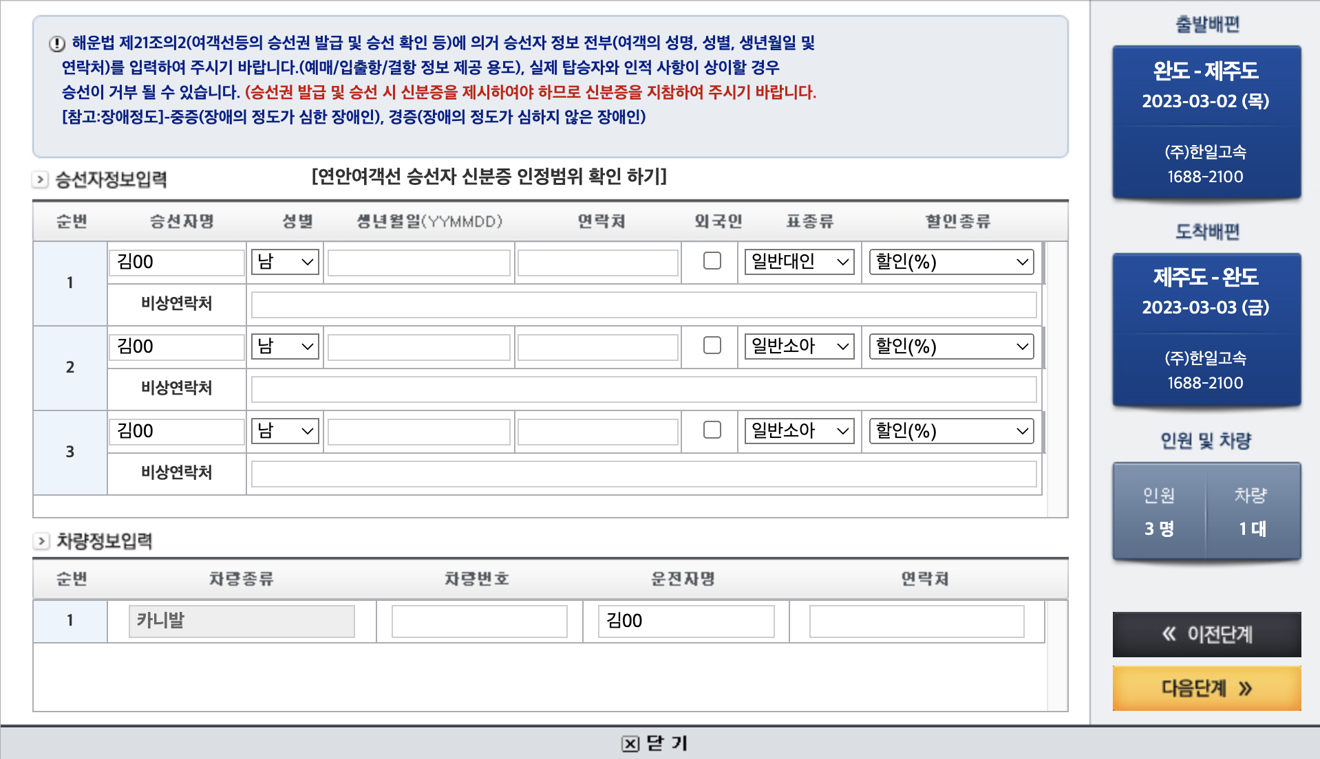 4. 승선자명, 성별, 생년월일, 연락처, 표종류(일반대인, 일반소아), 차량정보입력(차량종류, 차량번호, 운전자명, 연락처) 입력후에 '다음단계' 버튼을 클릭한다.