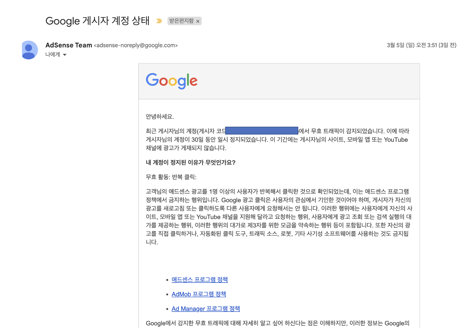 | 안녕하세요. 최근 게시자님의 계정(게시자 코드: pub-000000000)에서 무효 트래픽이 감지되었습니다. 이에 따라 게시자님의 계정이 30일 동안 일시 정지되었습니다. 이 기간에는 게시자님의 사이트, 모바일 앱 또는 YouTube 채널에 광고가 게재되지 않습니다. 내 계정이 정지된 이유가 무엇인가요? 무효 활동: 반복 클릭: 고객님의 애드센스 광고를 1명 이상의 사용자가 반복해서 클릭한 것으로 확인되었는데, 이는 애드센스 프로그램 정책에서 금지하는 행위입니다. Google 광고 클릭은 사용자의 관심에서 기인한 것이어야 하며, 게시자가 자신의 광고를 새로고침 또는 클릭하도록 다른 사용자에게 요청해서는 안 됩니다. 이러한 행위에는 사용자에게 자신의 사이트, 모바일 앱 또는 YouTube 채널을 지원해 달라고 요청하는 행위, 사용자에게 광고 조회 또는 검색 실행의 대가를 제공하는 행위, 이러한 행위의 대가로 제3자를 위한 모금을 약속하는 행위 등이 포함됩니다. 또한 자신의 광고를 직접 클릭하거나, 자동화된 클릭 도구, 트래픽 소스, 로봇, 기타 사기성 소프트웨어를 사용하는 것도 금지됩니다. Google에서 감지한 무효 트래픽에 대해 자세히 알고 싶어 하신다는 점은 이해하지만, 이러한 정보는 Google의 독자적인 감지 시스템을 우회하는 데 사용될 수 있으므로 무효 활동과 관련되었을 수 있는 웹페이지, 사용자 등 구체적인 계정 활동에 대한 정보를 게시자에게 제공할 수 없음을 양해해 주시기 바랍니다. 이번 계정 정지는 일회성 조치이며 이의신청은 받지 않습니다. 30일이 지나면 계정에서 광고 게재가 자동으로 재개됩니다. 무효 트래픽의 원인을 찾아서 문제를 해결하는 데 시간이 더 필요하시면 게시자님의 사이트, 모바일 앱 또는 YouTube 채널에서 광고 코드를 삭제하여 광고가 더 이상 게재되지 않게 해 주세요. 게시자 계정에서 문제가 추가로 발견되면 계정 정지 기간이 종료되기 전이라도 계정이 영구적으로 사용 중지될 수 있습니다. 이때 가능하고 적절한 경우 Google에서는 해당 광고주에게 환불하기 위해 최대 지난 60일 동안 발생한 총 수익에 대하여 위반과 관련된 수익을 지급 정지할 수 있습니다. 계정 해지의 주요 원인 목록에서 계정이 사용 중지되는 이유에 대해 알아보세요. 계정이 정지되면 수익금 지급은 어떻게 되나요? 계정 정지가 해제되고 계정에서 유효한 트래픽이 충분히 발생하면 수익을 다시 받으실 수 있습니다. 계정이 정지되면 무효 활동에서 발생한 수익이 게시자님의 수입에서 차감될 수 있으며, 가능하고 적절한 경우 광고주에게 환불됩니다. 계정이 다시 정지되지 않게 하려면 어떻게 해야 하나요? 문제의 근본 원인을 파악하려면 다음 자료를 검토해 보시기 바랍니다.