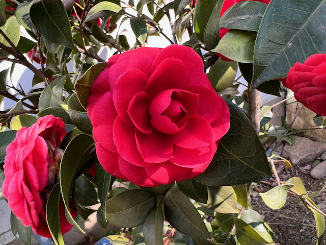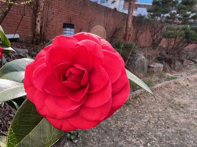 그리고 몇년전에 마당 한켠에 심어놓은 동백나무에 붉은 꽃이 활짝 폈습니다.