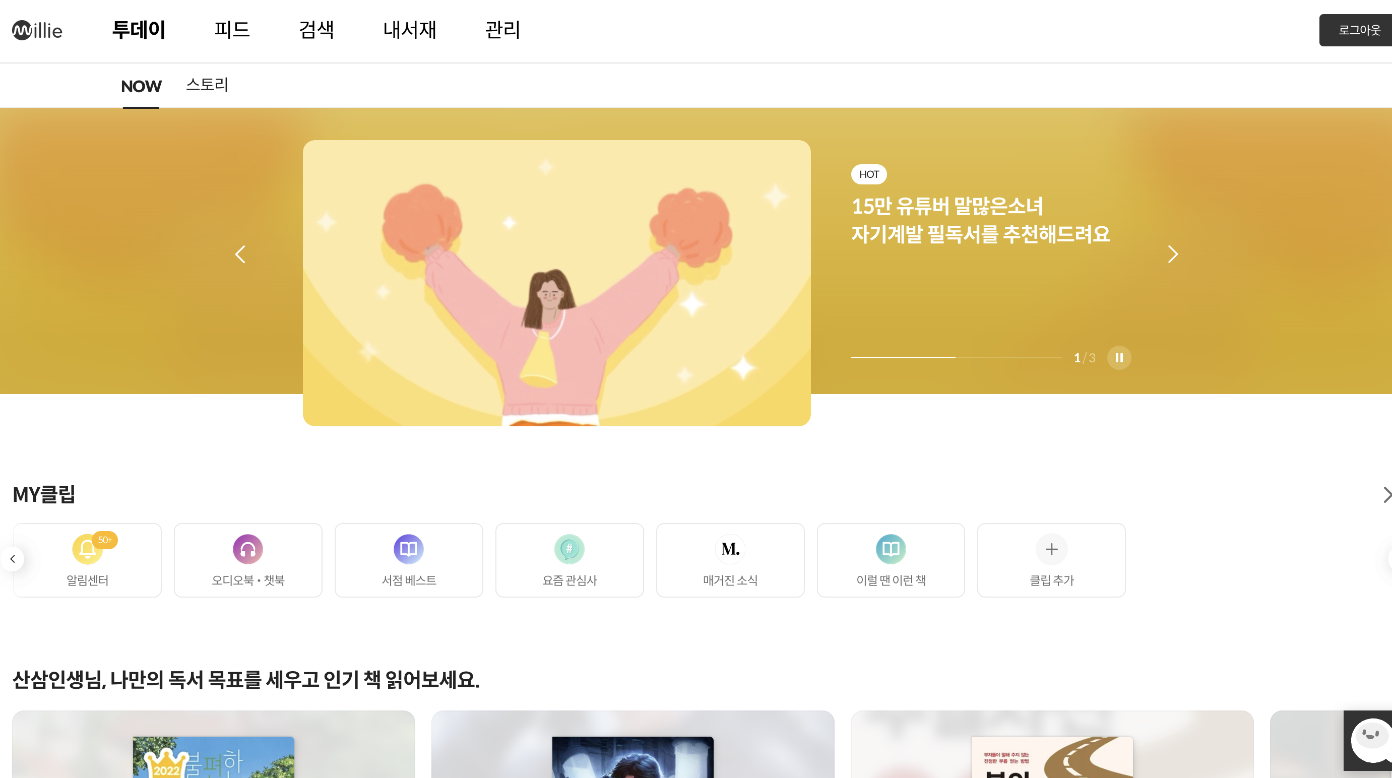 투데이에는 홈 화면입니다. 이벤트, 오디오북 플레이리스트, 요즘 관심사, 이번 주 주목할 책, 밀리의 발견(회원들의 책 추천),