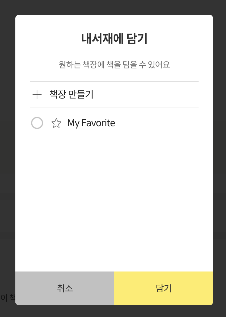 내서재에 담기 버튼을 클릭하면 '책장 만들기' 기능으로 책장을 만들거나,
