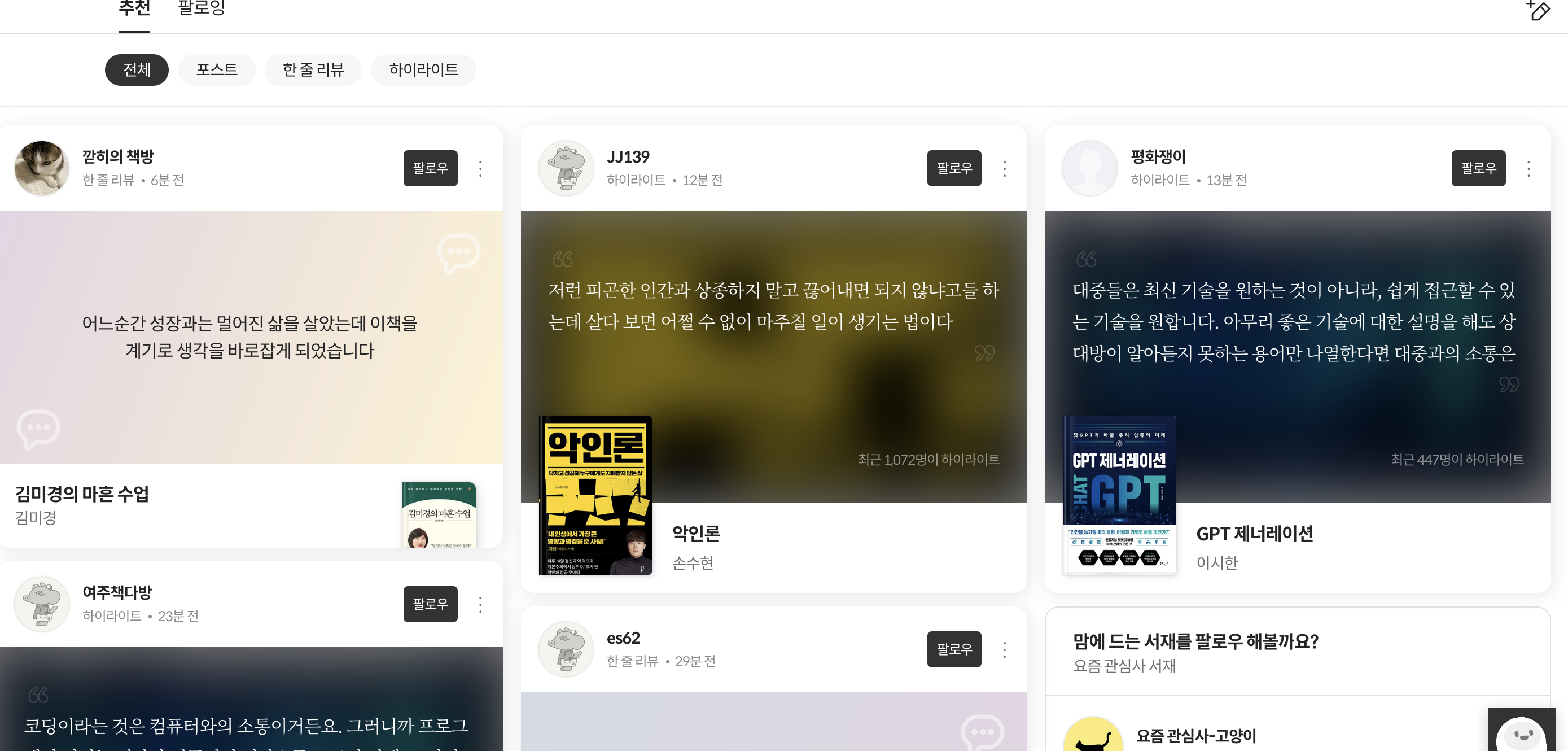 피드는 밀리의 서재 회원들의 피드백이 실시간으로 확인할 수 있고, 추천하는 책을 확인할 수 있습니다.