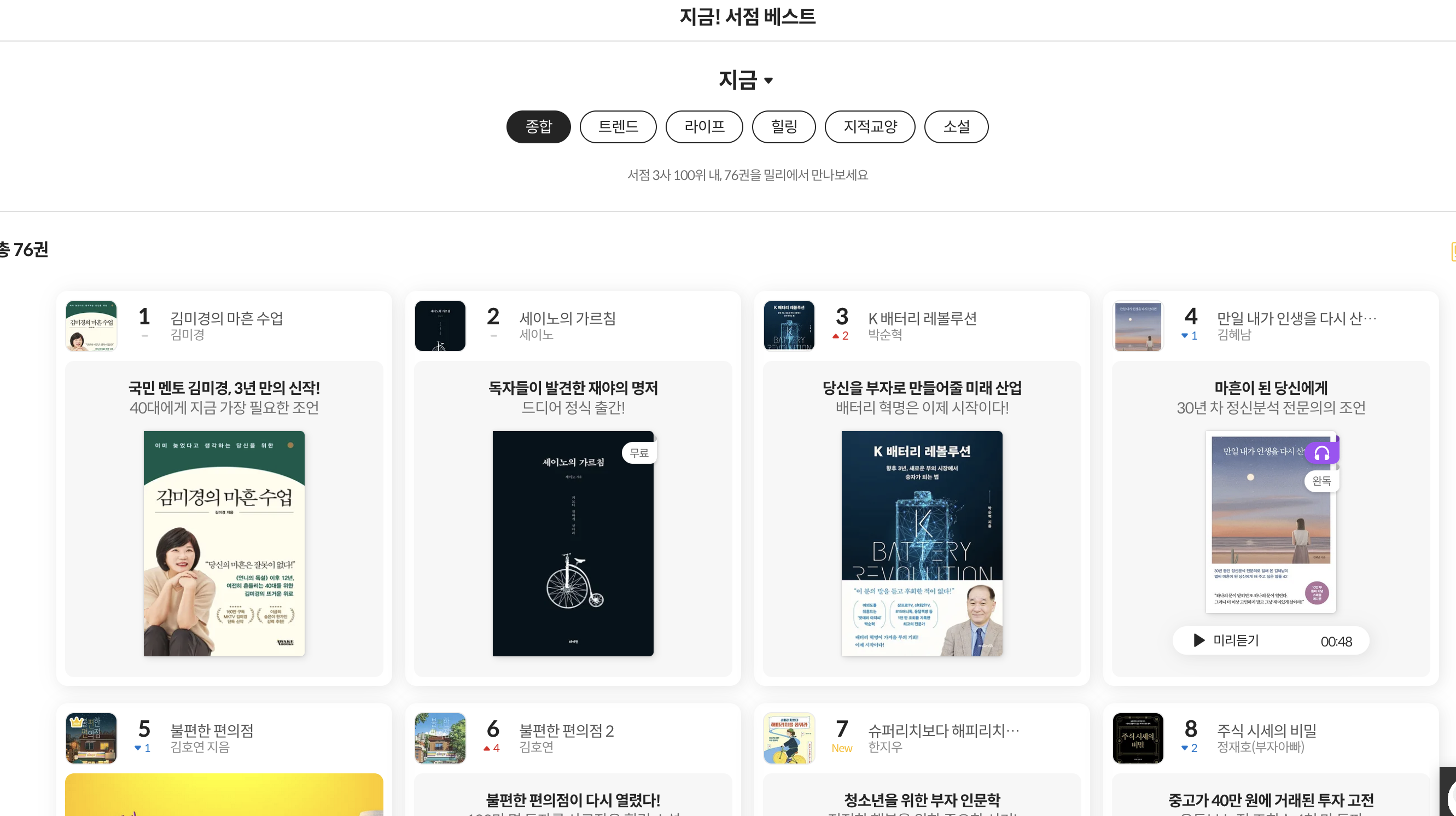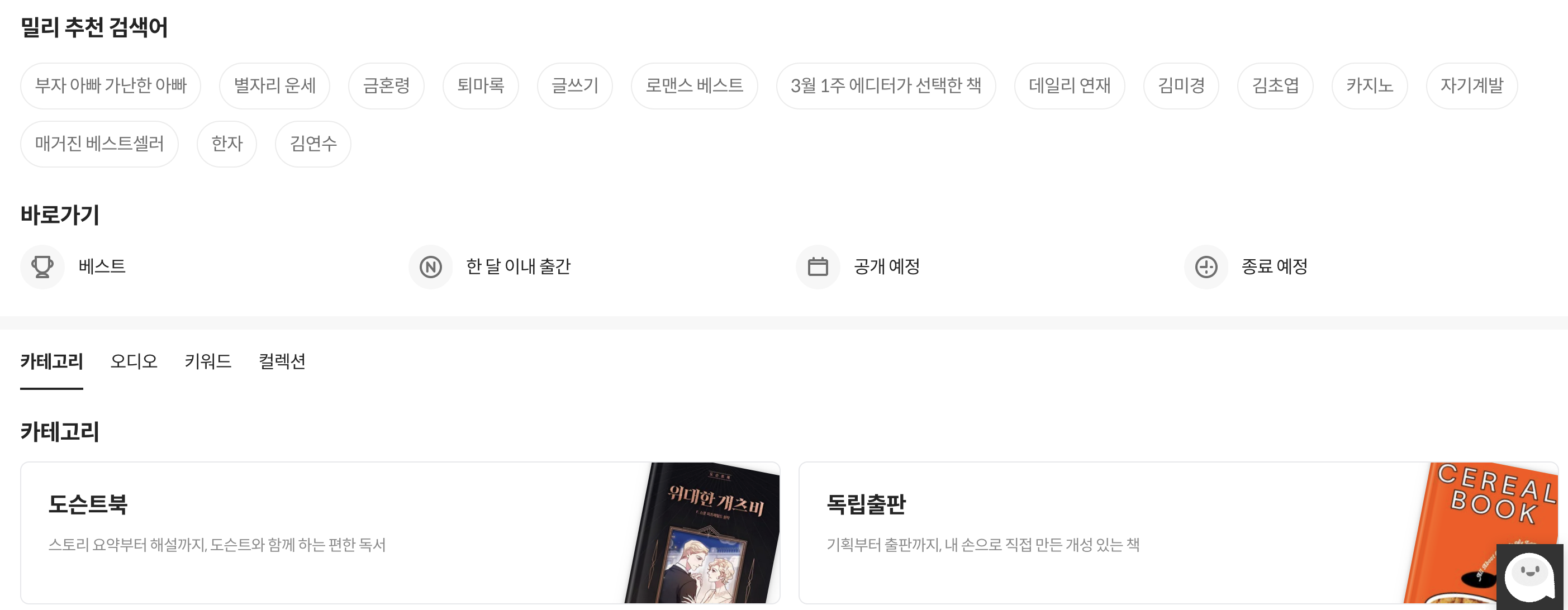 오디오 드라마, 서점 베스트, 도슨트북, 책방여행(동네책방소식), 밀리로그, 여성들을 위한 추천 책,