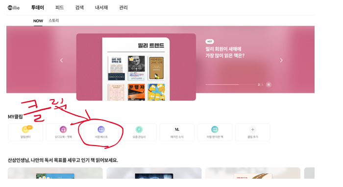 투데이 메뉴에서 화면에 보이는 MY클립 > 서점 베스트 버튼을 클릭합니다.
