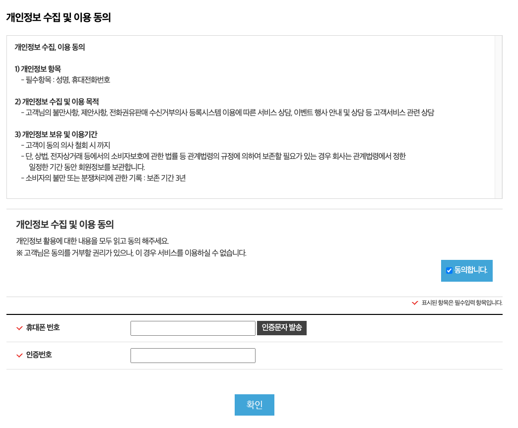 약관에 동의를 한 다음에 '확인' 버튼을 클릭합니다.