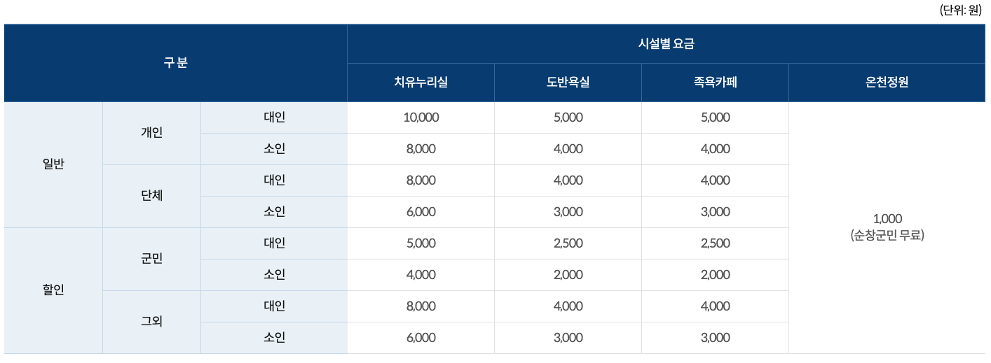 비용은 치유누리실이 대인 10,000원, 소인 8,000원입니다.