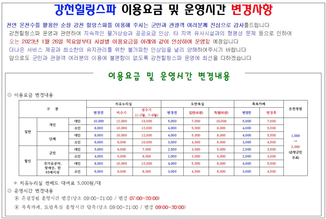 2023년 1월 26일 부터 시설 이용요금이 인상이 됩니다.