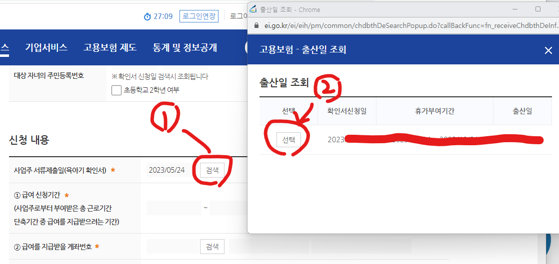신청내용에서 '검색' 버튼 클릭하면 회사에 제출한 신청일이 나옵니다. '선택' 하면됩니다.