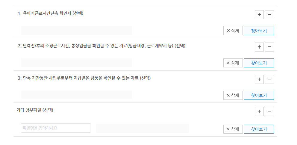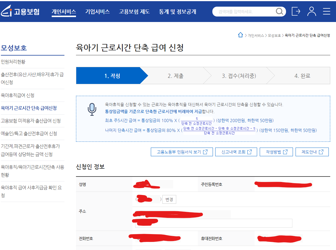 4. 육아기 근로시간 단축 급여 신청 화면이 나옵니다