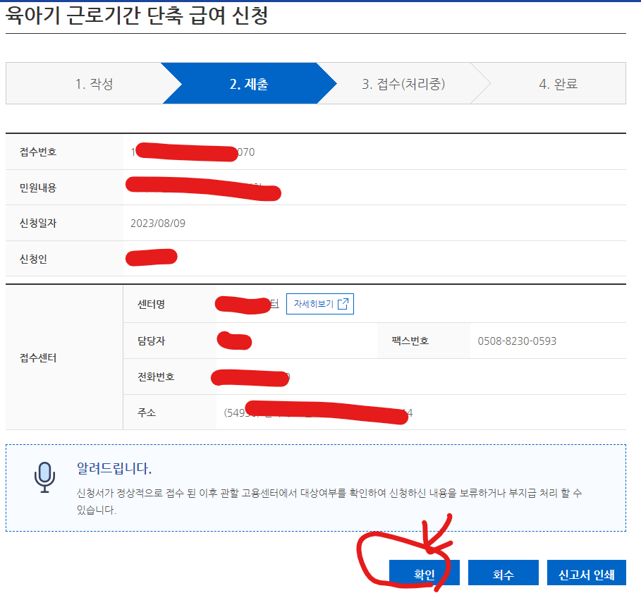 9. 마지막으로 하단에 '확인' 버튼을 눌러야지 최종 제출이 됩니다.