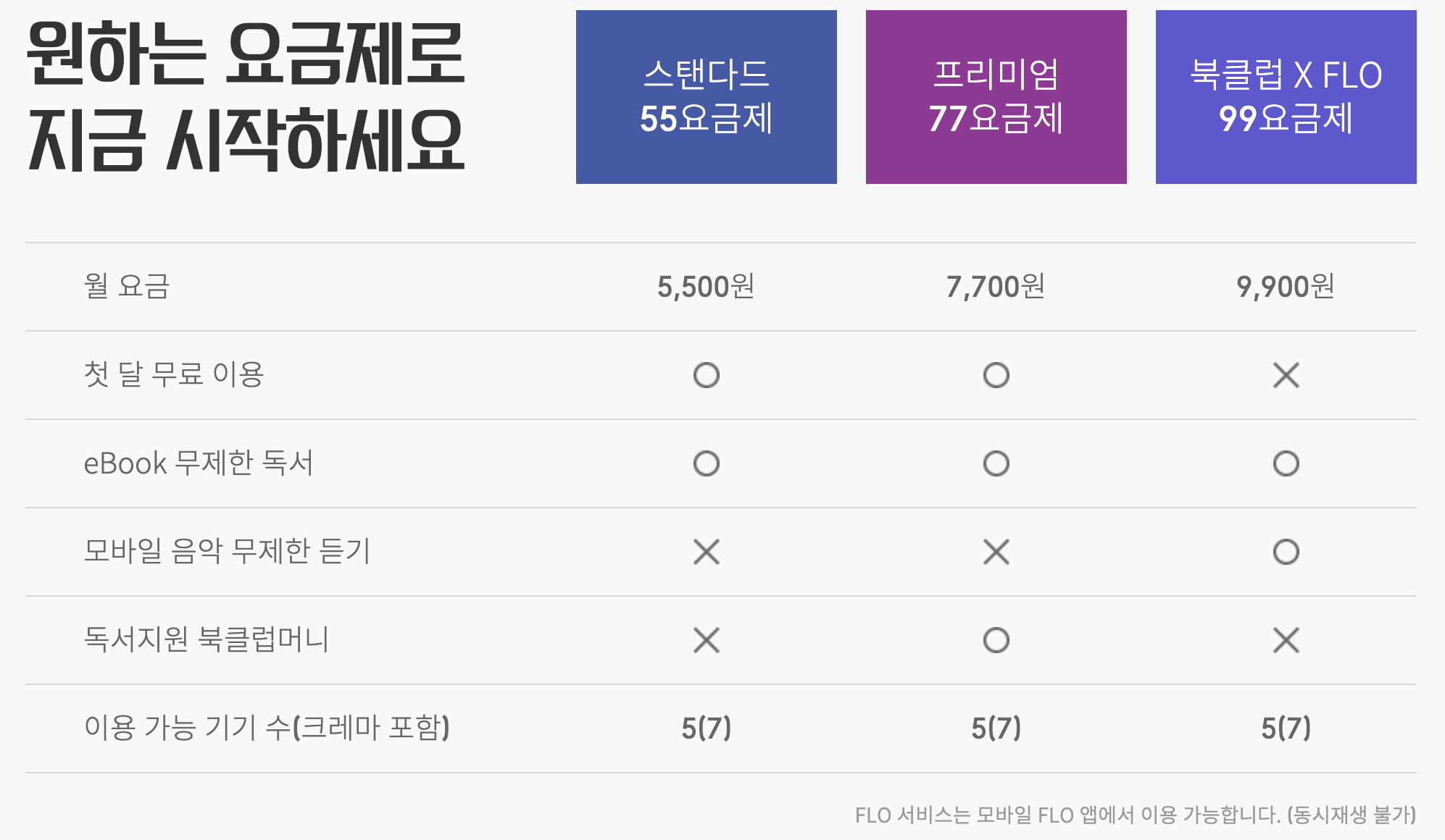 스탠다드 55요금제, 프리미엄 77요금제, 북클럽 X FLO 99 요금제